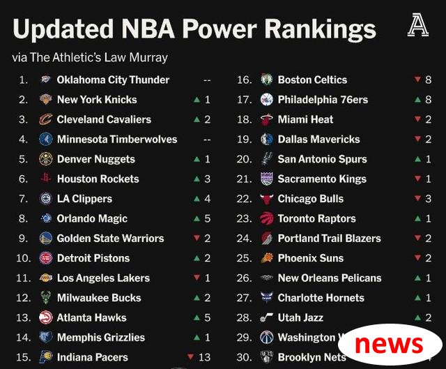 Tất nhiên, để đặt nó một cách hợp lý, chỉ cần nhìn vào danh sách sức mạnh, tất cả đều dựa trên thứ hạng thời gian thực. Mùa trước, Cavaliers được xếp hạng đầu tiên trong Hội nghị Đông, Knicks đã vào Chung kết Hội nghị Đông, Timberwolves vào Chung kết Hội nghị phương Tây, và Thunder là nhà vô địch, vì vậy thứ hạng sẽ tự nhiên cao.